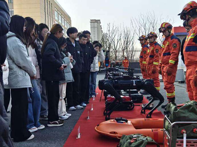师生党员首先进入消防装备展示区进行参观。消防无人机、水域救援设备、破拆工具、隔热防护服、正压式空气呼吸器等各类专业器材有序陈列,全方位展现现代消防救援的科技化与专业化水平。消防员结合实战案例,逐一讲解装备功能原理、操作规范与适用场景,重点介绍了无人机火场侦察、破拆工具救援应用、空气呼吸器防护要点等内容。党员们围拢观摩、积极提问,还现场演示了消防机械狗与各类现代化灭火装置,直观展现智能装备在火情侦察、高危环境作业等场景的实战应用。近距离接触消防装备,让党员们真切体会到消防救援工作的严谨与不易,深刻认识到科技赋能对提升救援效率、保障人员安全的重要意义。